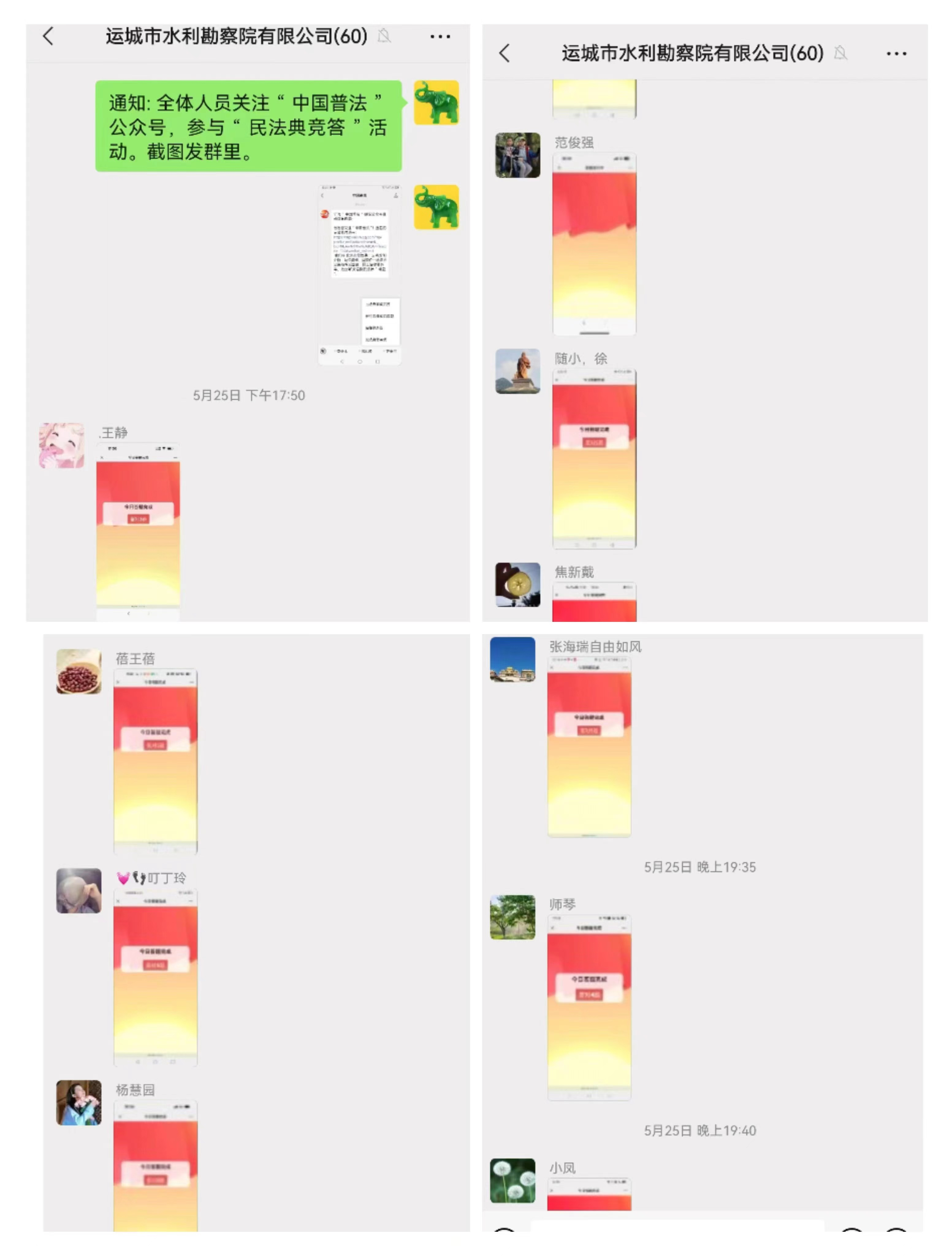 5月25日以來,公司組織全體干部職工開展“美好生活·民法典相伴”主題宣傳線上每日答題活動(dòng),活動(dòng)主題思想以深入學(xué)習(xí)民法典,大力弘揚(yáng)社會(huì)主義核心價(jià)值觀,大力弘揚(yáng)社會(huì)主義法治精神。大家積極線上自主自學(xué),全體干部職工了解熟悉民法典一系列規(guī)定,增強(qiáng)自覺學(xué)習(xí)民法典的意識(shí),不斷樹立遵法、知法、學(xué)法、懂法、守法意識(shí),在民法典宣傳引導(dǎo)中弘揚(yáng)法治精神、匯聚法治力量、提升法治水平。