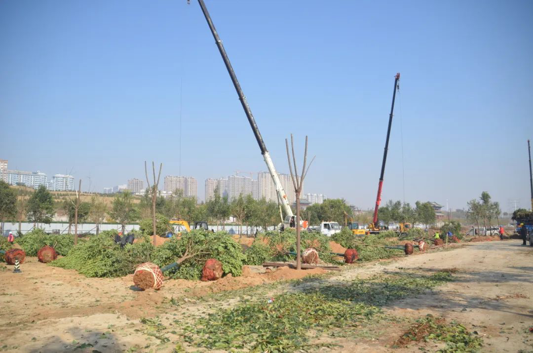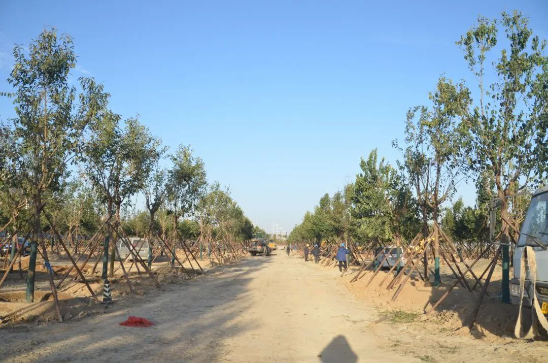 施工現(xiàn)場,大型機械集中作業(yè),挖掘機、裝載機、吊裝機和運輸車來回穿梭,九十余名工人辛勤勞作,相互配合,干勁十足,按設(shè)計規(guī)定放線挖坑、吊裝樹木、培土壓實,防護林建設(shè)有序進行。栽植過程中,多次討論研究,結(jié)合鹽池生態(tài)環(huán)境,統(tǒng)籌考慮,因地制宜選擇當?shù)卦灾矘浞N,目前已種植國槐、榆樹、大葉女貞、紅葉石楠、大葉黃楊、金森女貞、麥冬等各類喬灌木草種共計700余株,綠化種植面積2萬多平米,綠化建設(shè)將進一步對鹽湖北側(cè)岸帶生態(tài)系統(tǒng)起到很好的防護作用。