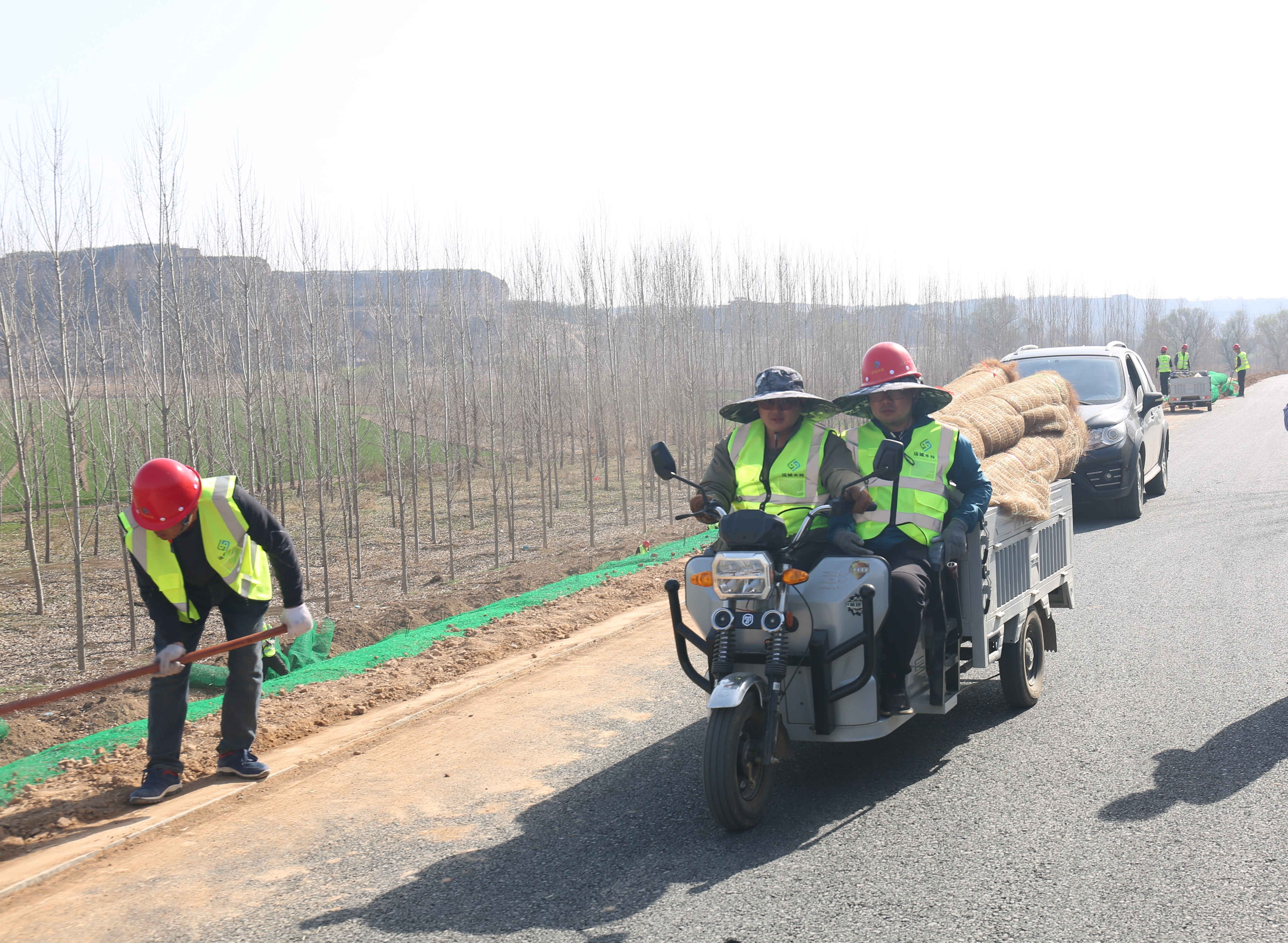 施工現(xiàn)場(chǎng),工程機(jī)械、運(yùn)輸車(chē)輛、施工人員正在加緊作業(yè)。一片片椰絲毯經(jīng)過(guò)清除坡面雜物、坡度整修、開(kāi)挖坑槽、播撒草籽等八道程序才能完好鋪設(shè)在大壩上。椰絲毯是一種新型環(huán)保材料,具有良好的吸水性、保濕性和透氣性,這種環(huán)保材料既可以起到穩(wěn)固河道邊坡、防止河岸沖刷破壞的作用,同時(shí)還能優(yōu)化生態(tài)環(huán)境。