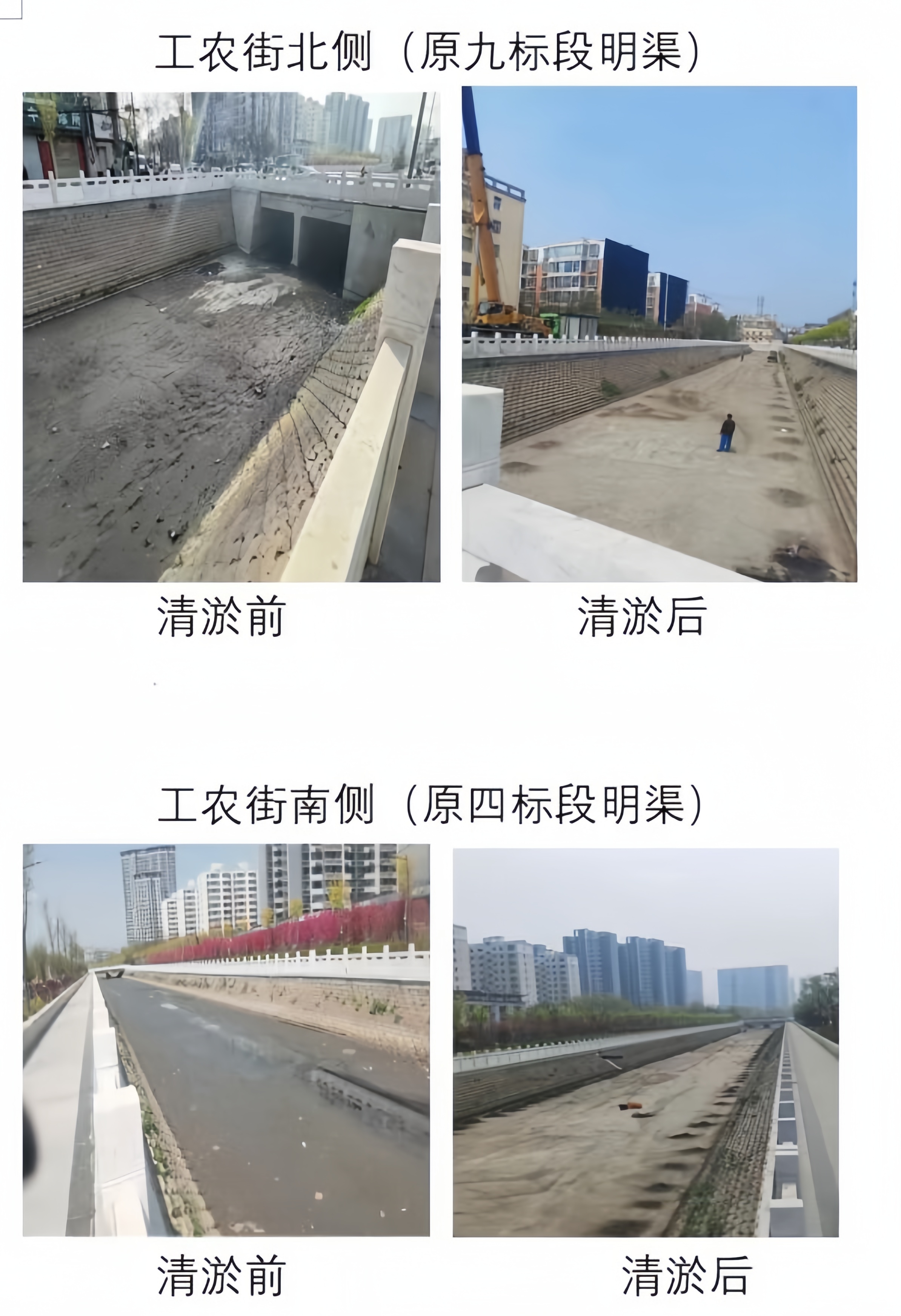 由于時(shí)間緊,任務(wù)重,為加快清淤進(jìn)度,確保施工安全,結(jié)合干河實(shí)際情況,采用人工和機(jī)械相結(jié)合的方式進(jìn)行,共清理2110m渠道。清理后河道變深、河水變清,周邊環(huán)境得到明顯改善。