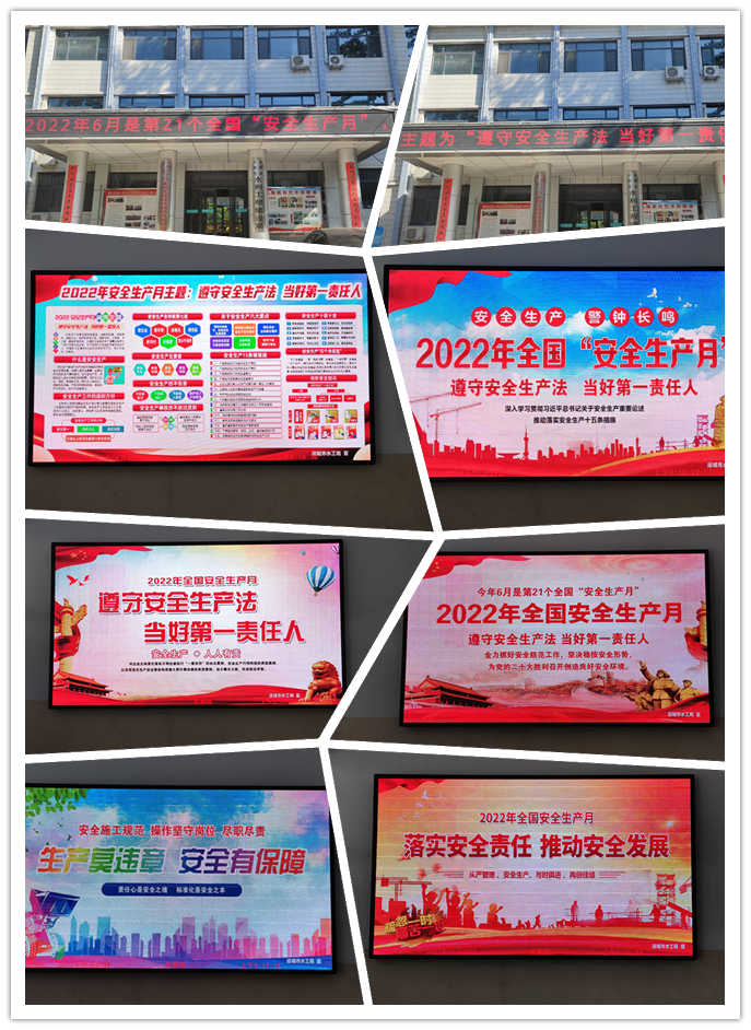 今年6月是全國第21個“安全生產(chǎn)月”,主題為“遵守安全生產(chǎn)法,當(dāng)好第一責(zé)任人”。為做好今年“安全生產(chǎn)月”的宣傳工作。近日,我公司通過門頭電子屏滾動播放宣傳標語、室內(nèi)電子屏展示安全生產(chǎn)知識、微信群發(fā)放最新版《中華人民共和國安全生產(chǎn)法》,時刻提醒公司全體員工遵守安全生產(chǎn)法,履行安全生產(chǎn)責(zé)任制。